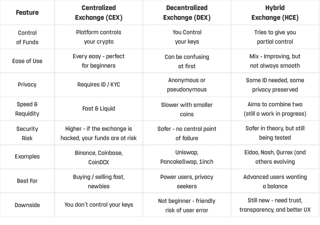 Hybrid exchanges like Eidoo or Nash try to combine the best of both worlds—CEX speed with DEX privacy and control. Cool concept, but still evolving. They’re not bad if you’re experienced and want to explore beyond the basics. But for beginners, sticking to a CEX + Wallet combo is usually simpler (and safer, for now).
