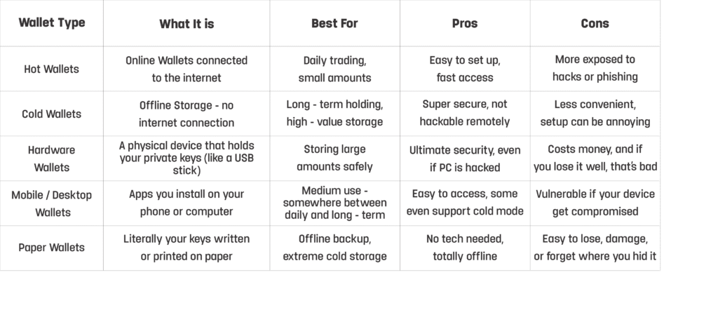 Hot Wallets These are connected to the internet and great for quick access. Think Meta. Mask, Trust Wallet, Phantom (for Solana).
